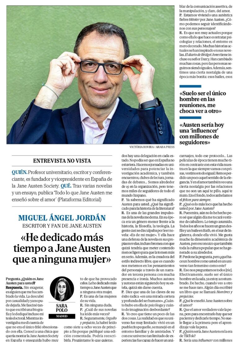 El pasado día 26 tuve el honor de impartir la conferencia «Jane Austen, mujer y escritora» a alumnado de la Nau Gran, el programa para gente mayor de la Universitat de València. Asistieron más de trescientas personas y hubo muchas y muy buenas preguntas. Fue un placer compartir un rato con un público tan selecto y, además, en el salón de actos de la facultad de Filología, Traducción y Comunicación, donde me siento como en mi casa, puesto que allí estudié la carrera, hice el máster, el doctorado y, actualmente, trabajo como profesor.